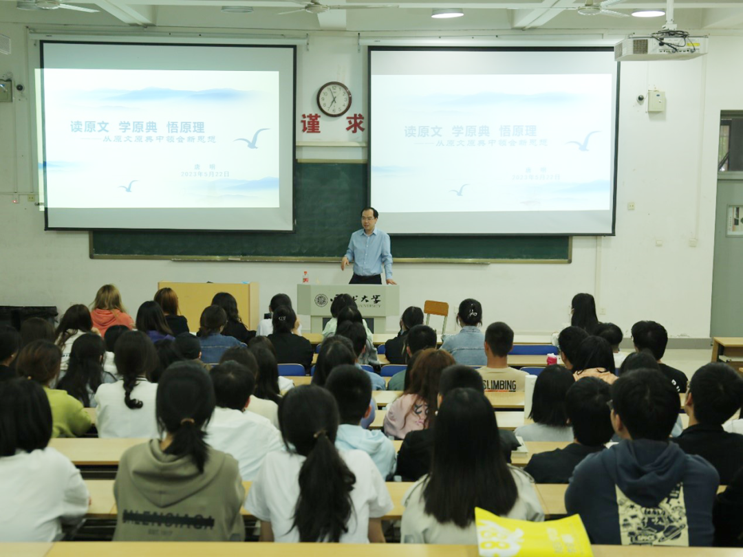 为深化广大青年学生对习近平新时代中国特色社会主义思想的学习理解,522日晚,242net必赢太阳能党校办副主任唐明为我院本科2022级、2021级同学讲授了题为“读原文、学原典、悟原理——从原文原典中领会新思想”的学习贯彻习近平新时代中国特色社会主义思想主题教育专题思政课。