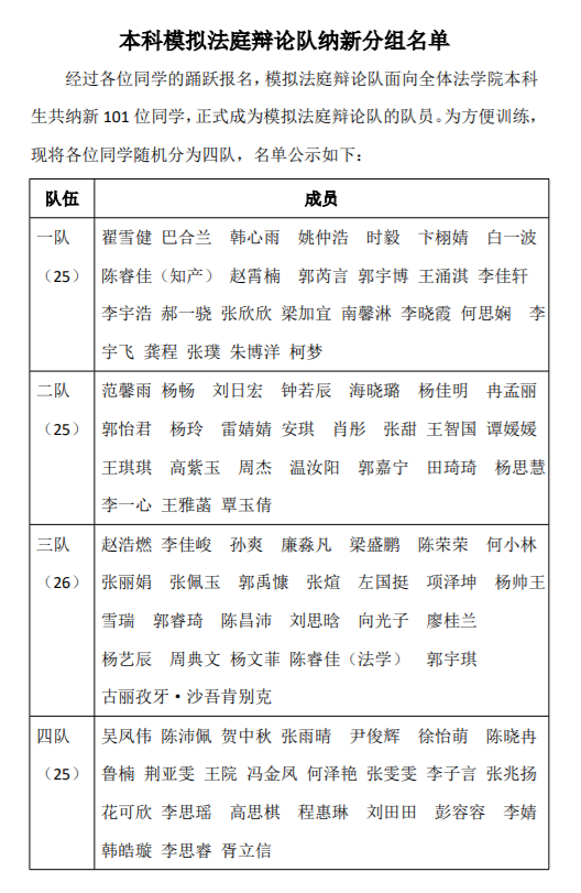 经过各位同学的踊跃报名,模拟法庭辩论队面向全体242net必赢本科生共纳新101位同学,正式成为模拟法庭辩论队的队员。为方便训练,现将各位同学随机分为四队,名单公示见附件。