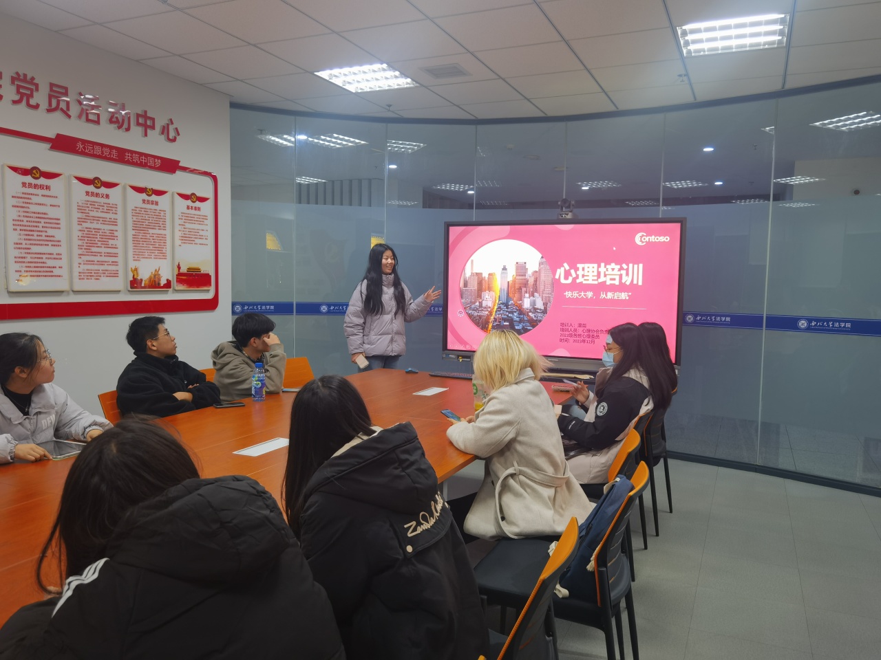 为了帮助心理委员、心协成员等学生骨干树立正确的健康观念,明确自身的角色定位,掌握必要的心理健康知识及助人技能,培养一批合格的“阳光使者”,使他们更好地以朋辈的身份开展大学生心理健康教育宣传活动,以助手的身份协助老师开展工作。我院于2023年12月3日在西学楼九层玻璃房内举行心理委员培训活动。