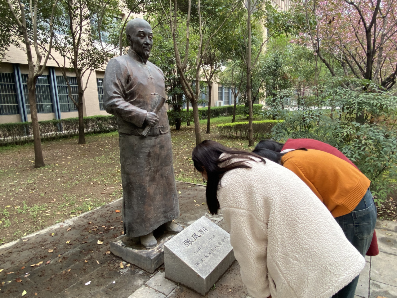 在活动过程中,学员们在先辈们雕像前雕像面前,集体默哀3分钟,表达深切的哀悼,并为侯先生的雕像擦拭尘土,深情鞠躬。深深表达了对于这些西大先辈们爱党爱国、矢志不渝的理想信念的崇高敬意,以及攻坚克难、勇攀高峰探索精神的向往。