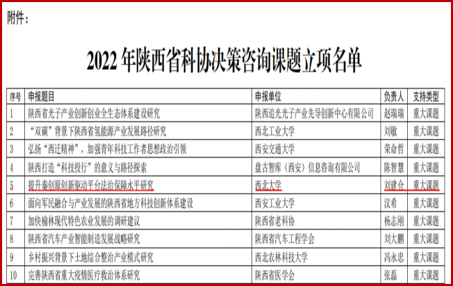 近日,陕西省科学技术协会公布了2022年度陕西省科协决策咨询课题立项名单,我院刘建仓副教授申报的课题获准重大课题立项,资助经费五万元